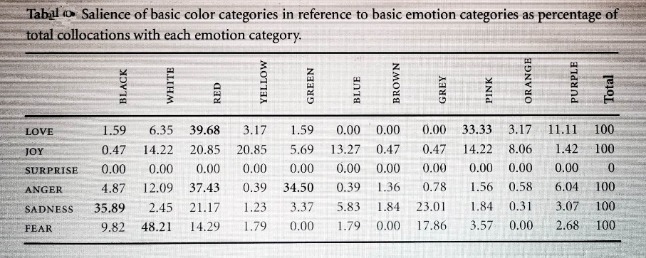 এই প্রশ্নের উত্তরে অনেকে বলেছেন, যেহেতু আমরা বলি ভয়ে/চিন্তায় মুখ সাদা/ফ্যাকাশে হয়ে যায়, তবে ভয়/চিন্তা/উদ্বেগের রঙ সাদা/ছাই-রঙা; যেহেতু আমরা বলি হৃদয় লাল রক্তযুক্ত, অর্থাৎ ভালোবাসার রঙ লাল/গোলাপী; আমরা বলি রাগে মুখ রক্তবর্ণ, তবে রাগের বহিঃপ্রকাশও ঘটে লাল রঙে। এভাবে অংশগ্রহণকারীদের মতামত নিয়ে গবেষণাটির ফলাফল আনুপাতিক হারে প্রকাশিত হয়। এই গবেষণাটি থেকে মানুষ কিভাবে অনুভূতিকেও রঙ দ্বারা উপলব্ধি করে সেই বিষয়টিই উপস্থাপিত হয়েছে।